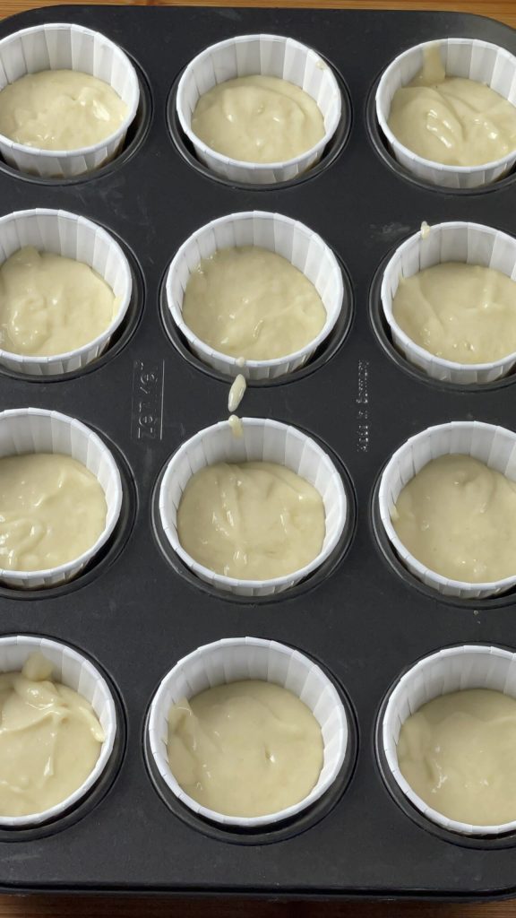 Je moet een mengsel krijgen dat niet te dik is en zonder klontjes.Verdeel het mengsel in de geschikte bakvormpjes, vul ze voor tweederde. Je kunt een lepel, een soeplepel of een ijsschep gebruiken.