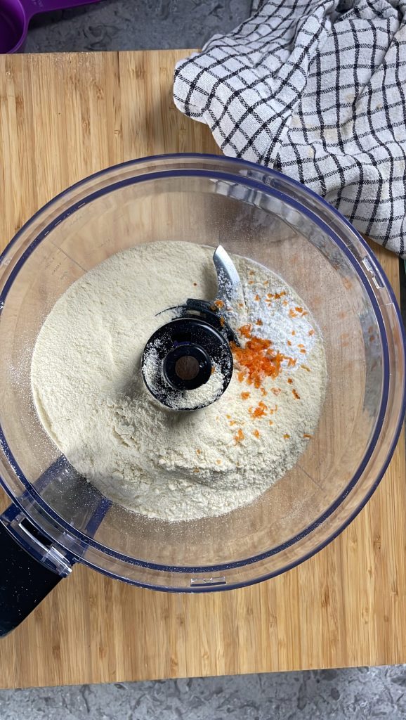 Begin met de bereiding van de clementine scones door de bloem 00, suiker, zout, bakpoeder en de schil van een onbespoten clementine in de kom van de keukenmachine te doen.