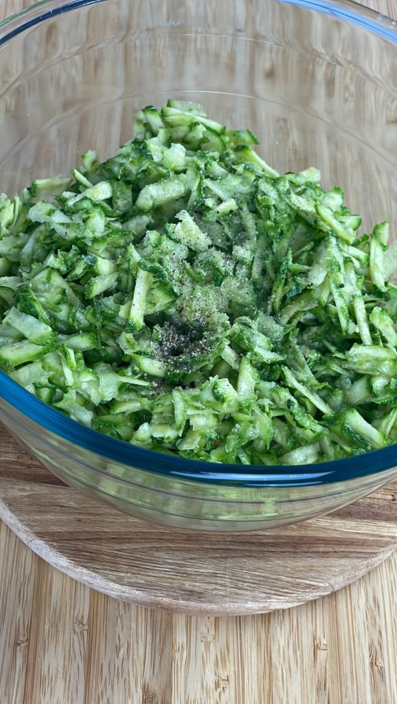 Rasp ze met een rasp met grote gaten.Doe de geraspte courgettes in een kom en breng op smaak met zout en zwarte peper.