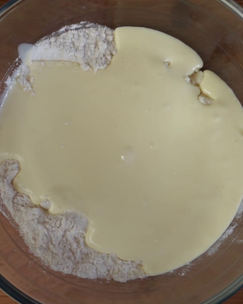 • Voeg de gesmolten boter en het ei toe aan de karnemelk en meng met de garde om alle ingrediënten te mengen.