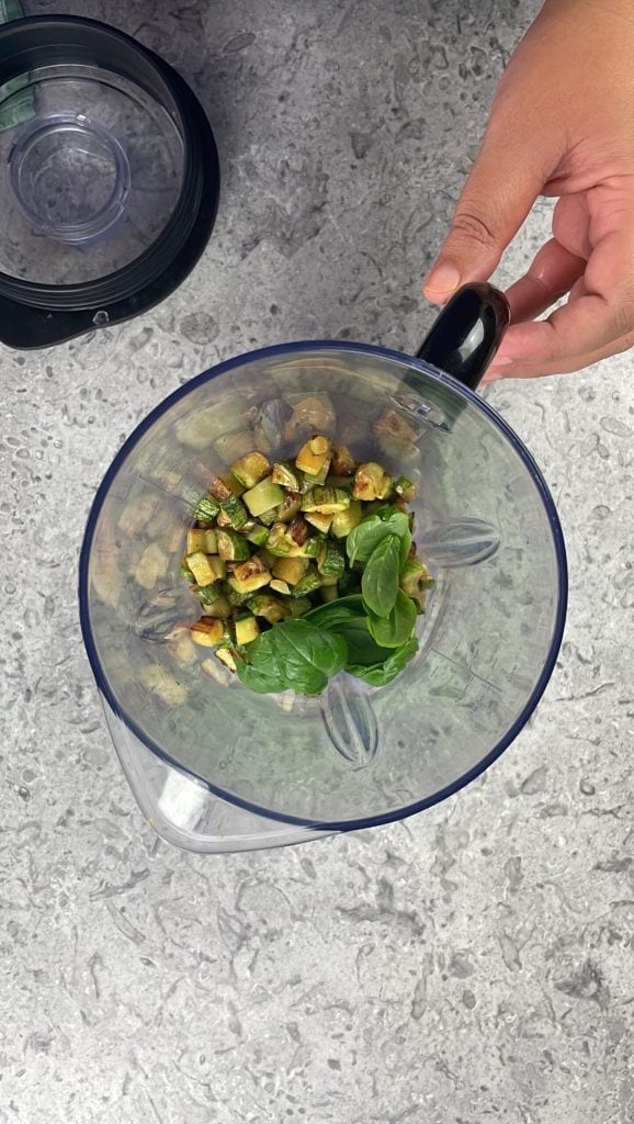 Zet de hittebron uit en voeg zout naar smaak toe.Doe de amandelen en courgettes in de blender.