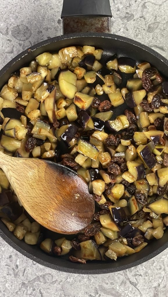Giet de rozijnen af en voeg ze toe aan de aubergines.