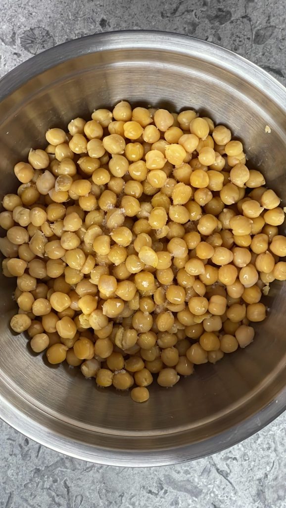 Bedek met een doek en laat het water 5 minuten absorberen.Doe de gekookte kikkererwten in een kom.