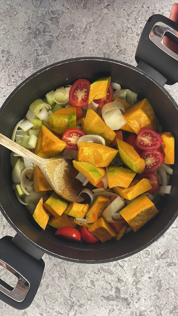 Doe ook de cherrytomaatjes en pompoen erbij en kook nog 5 minuten regelmatig roerend.