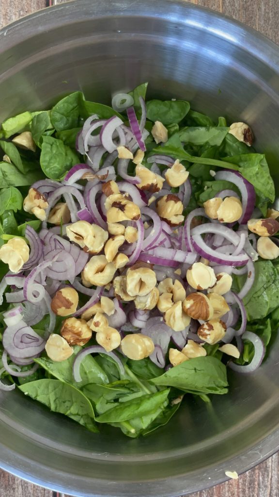 Verplaats ze naar een kleine kom en zet ze apart.Doe in een grotere kom de gewassen en gedroogde spinazieblaadjes, een fijngesneden rode lente-ui en een handvol gehakte hazelnoten.