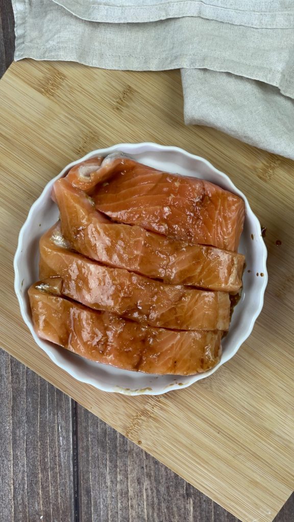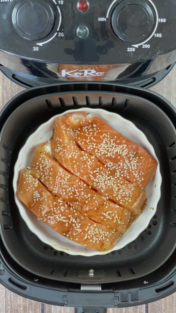 Gemarineerde zalm in de airfryer, een smakelijke en gezonde schotel die de praktische voordelen van luchtkoken combineert met de voedingsrijke en heerlijke smaak van zalm.