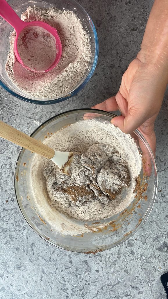 Meng met een spatel tot het goed gemengd is, maak je geen zorgen als het plakkerig is, dat is normaal.