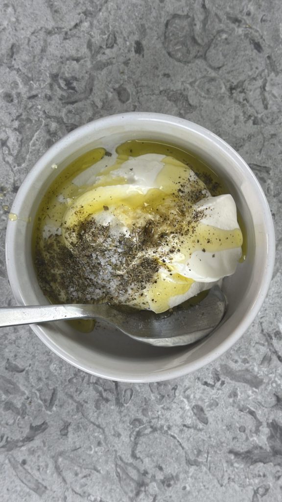 Voeg aan de yoghurt (je kunt gewone of Griekse yoghurt gebruiken) een geraspt teentje knoflook toe, een snufje gedroogde oregano, een eetlepel extra vergine olijfolie, zout en zwarte peper.