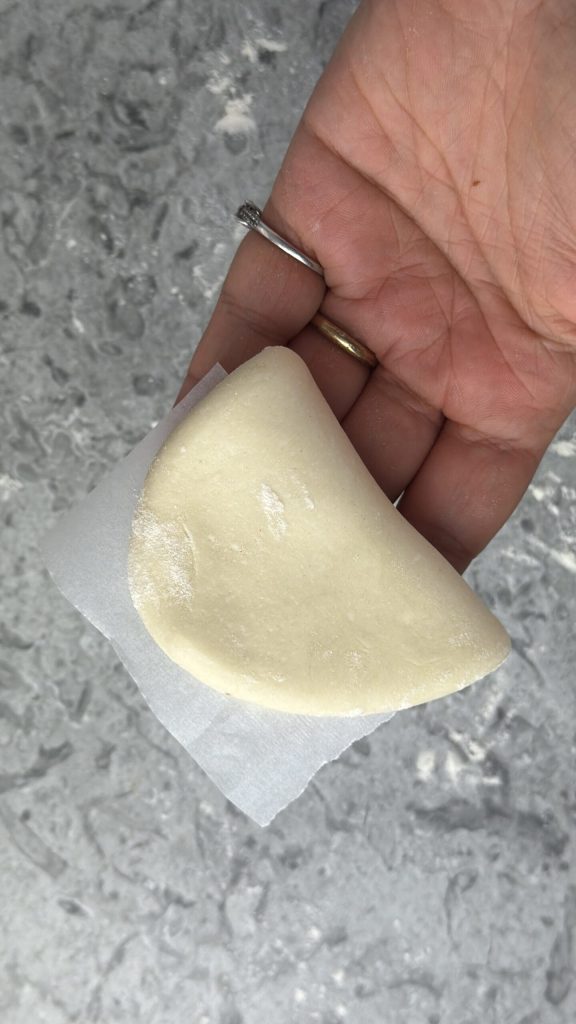 Leg op de helft van de deegstrip een stukje bakpapier en vouw het dicht over zichzelf.
