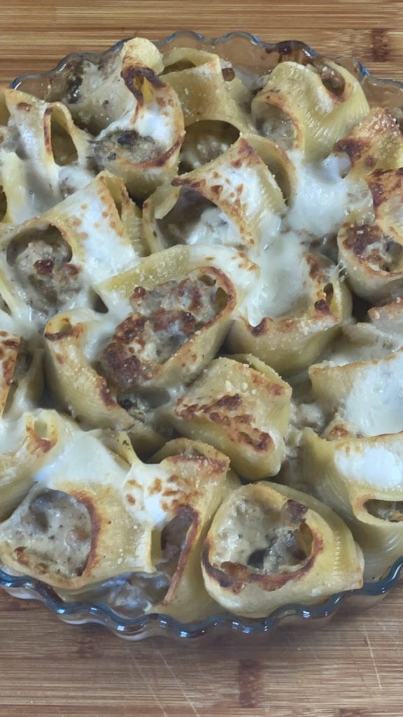 Gevulde lumaconi met champignons en worst, een rijk en smaakvol hoofdgerecht perfect om te serveren tijdens zondagse maaltijden of speciale gelegenheden en feestdagen.