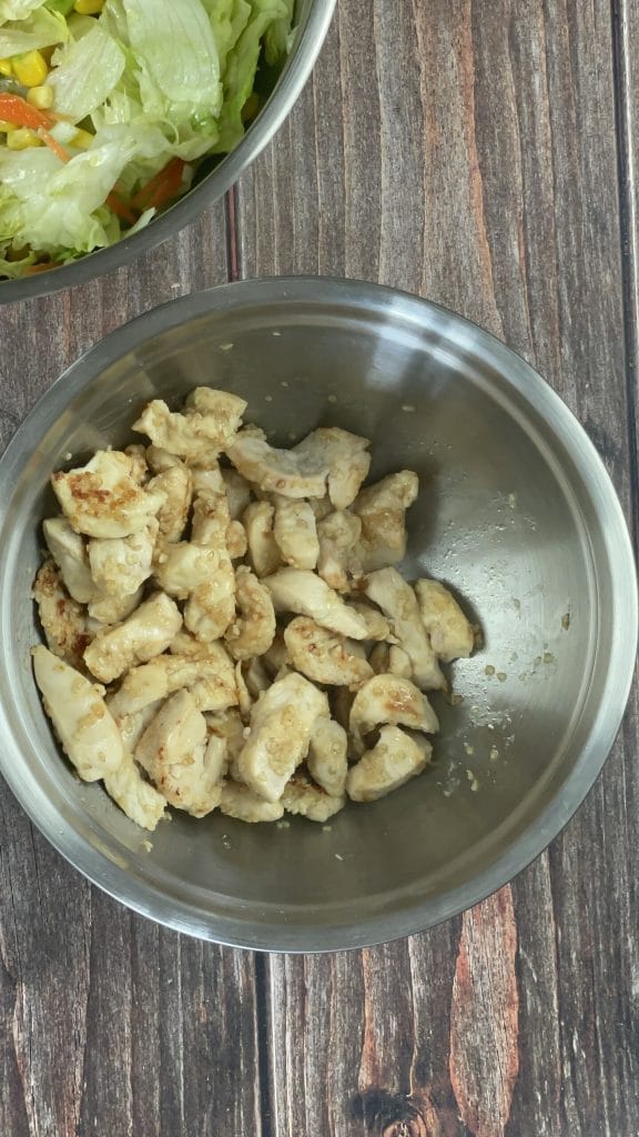 Als het afgekoeld is, voeg dan ook de kip toe aan de rest van de grote salade.