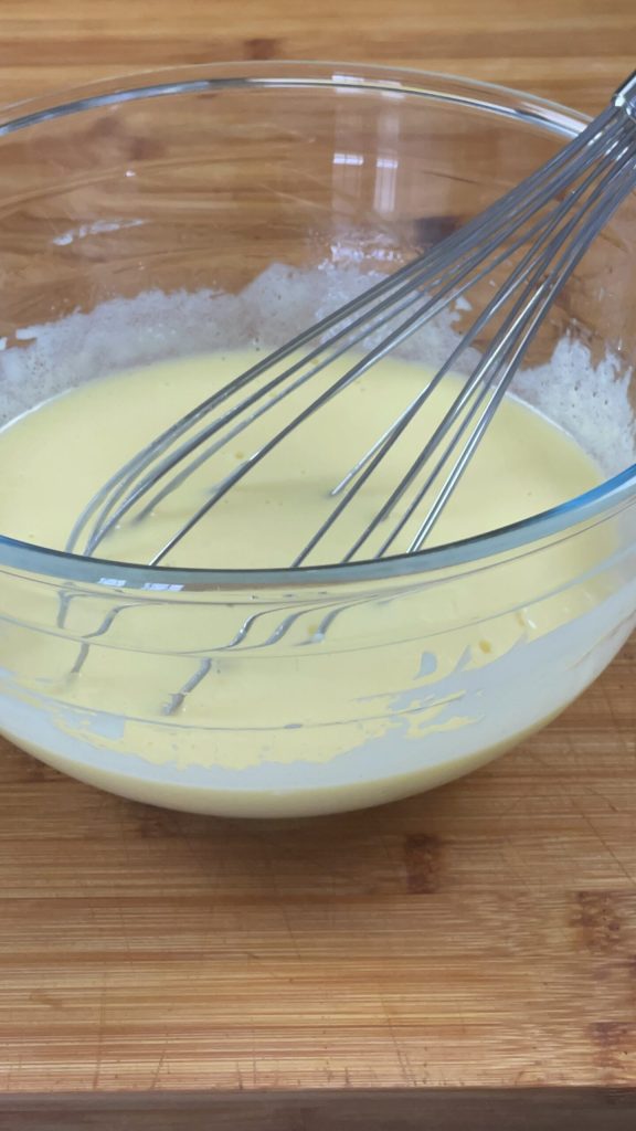 Begin met de bereiding van de hartige colomba taart door de eieren, de yoghurt, de melk en de zonnebloemolie in een schaal te doen.