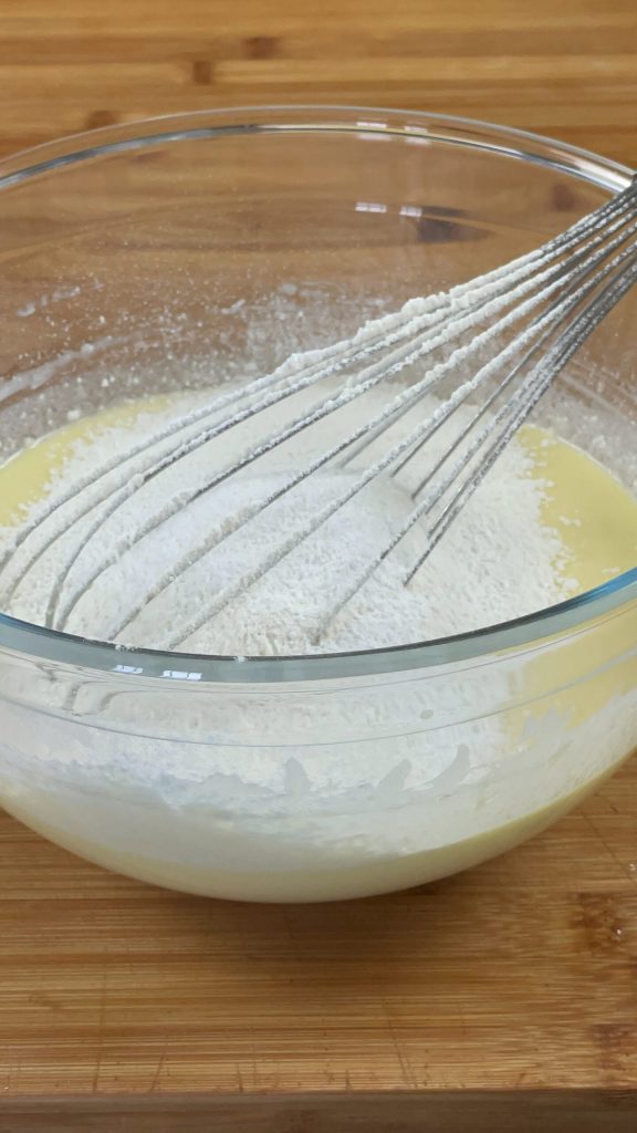 Mix eerst met de kloppers en gebruik een spatel wanneer het deeg dik genoeg is.Voltooi de voorbereiding van het deeg met de in blokjes gesneden Asiago.