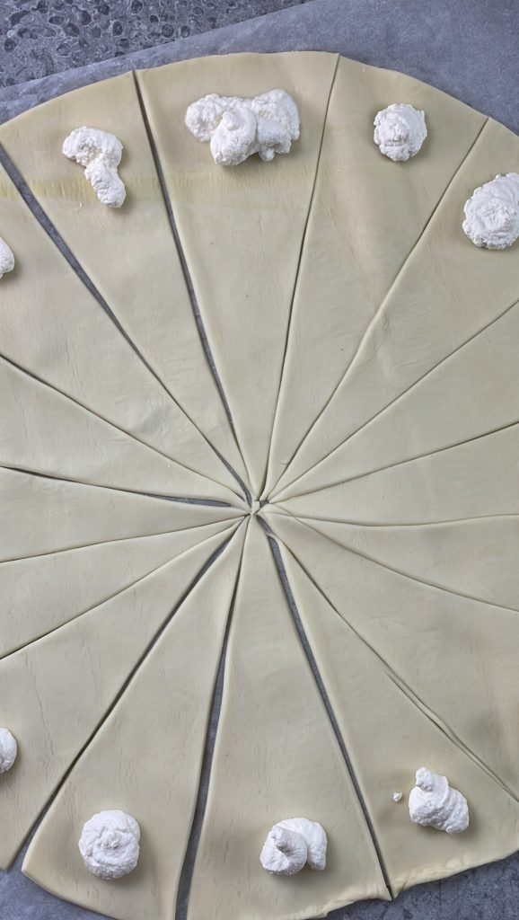 Verplaats de ricotta naar een spuitzak en doe een beetje aan de basis van elke bladerdeegdriehoek.