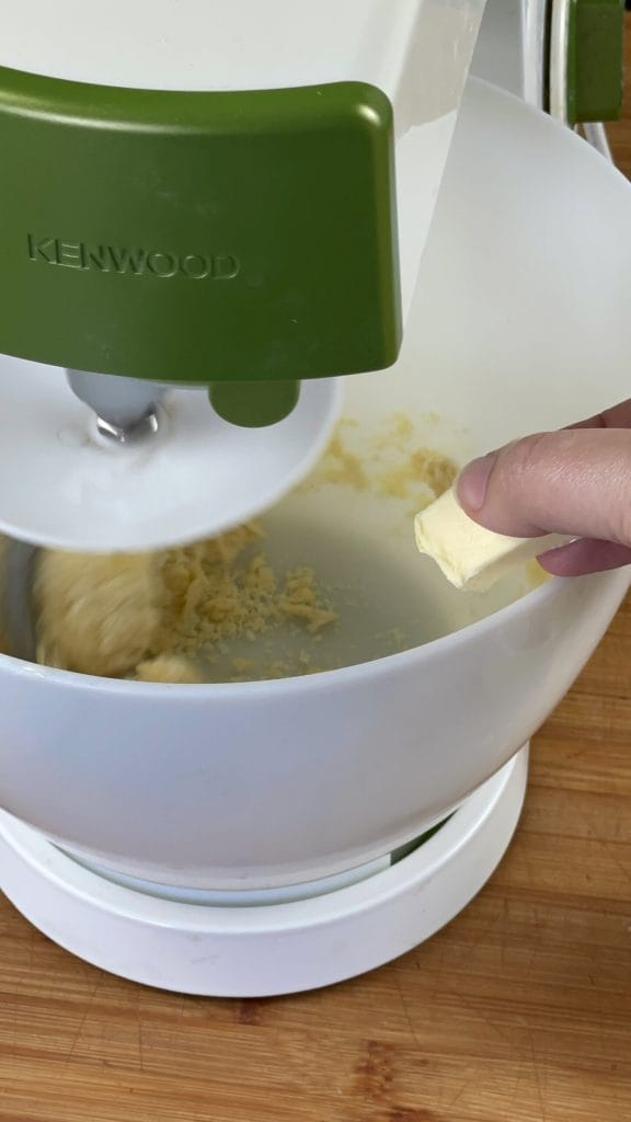 Begin op gemiddelde snelheid te kneden.Wanneer het deeg is samengekomen, begin dan met het toevoegen van de zachte boter een stukje per keer, zodat het volledig in het deeg wordt opgenomen voordat je een volgend stukje toevoegt.