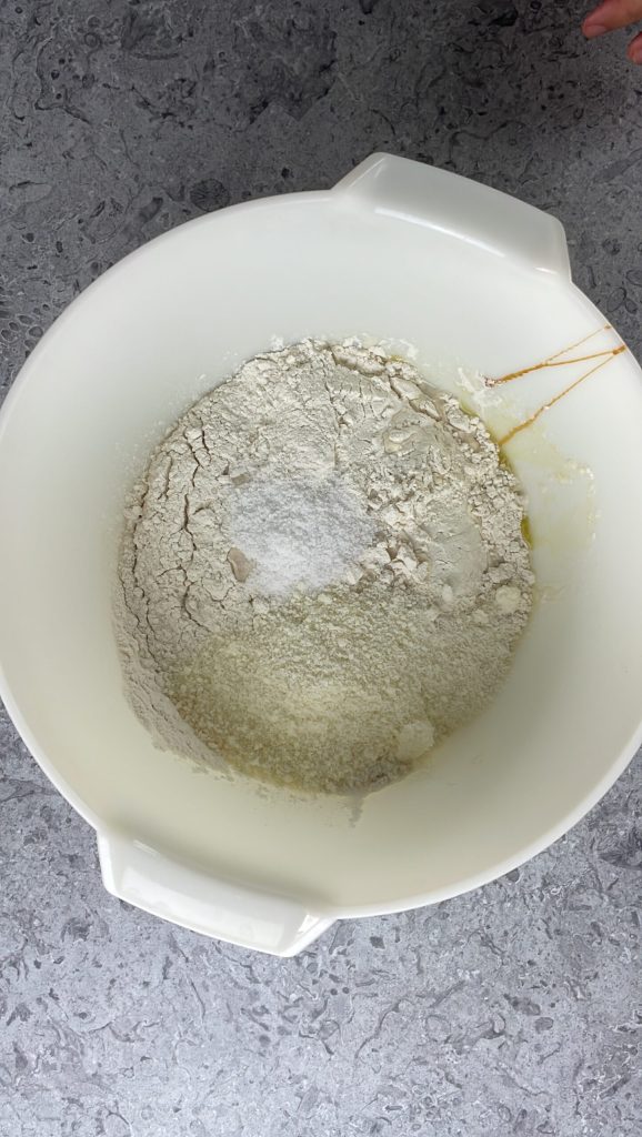Ga verder met de bloem, voeg dan de geraspte pecorino romano en het zout toe.