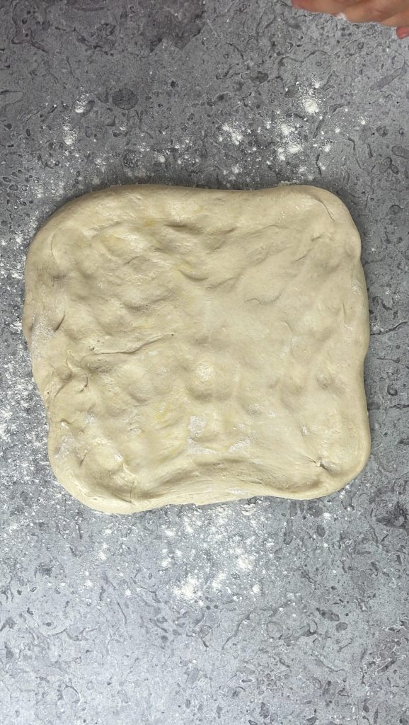 Neem het gerezen deeg, en strijk het lichtjes uit met de handen, verdeel het dan in porties van ongeveer 60 g.