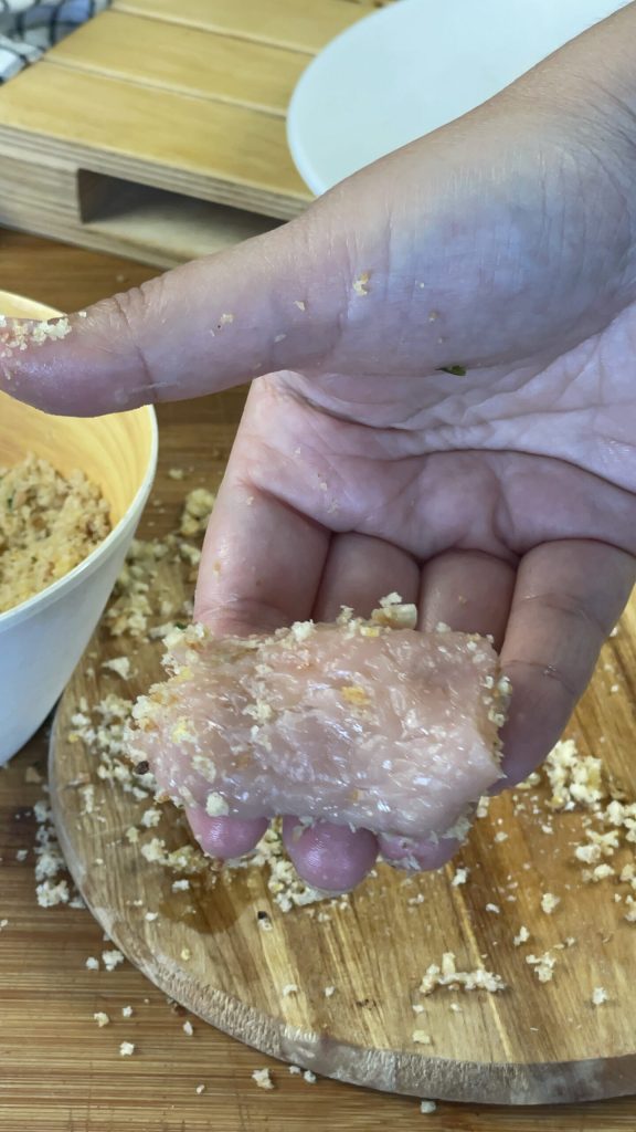 Leg opzij en ga verder met het vlees.Als de kalkoenplakken te dik zijn, sla ze dan voorzichtig met een vleeshamer zonder ze te breken.