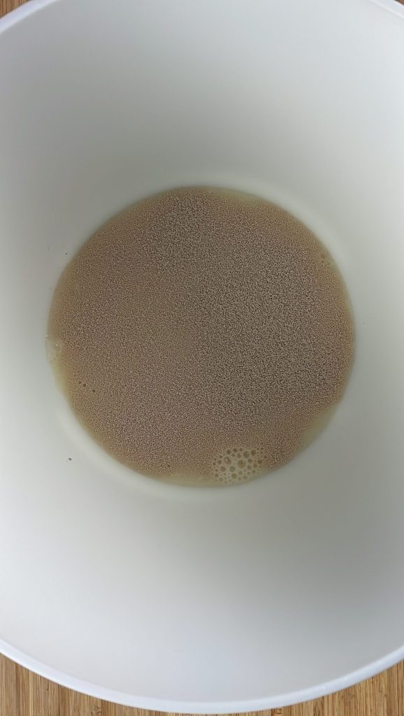 Strooi de droge bakkersgist eroverheen en laat het 5 minuten oplossen.