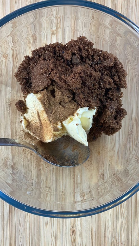 Weeg intussen in een kommetje de zachte boter, de ongeraffineerde rietsuiker en de kaneel.