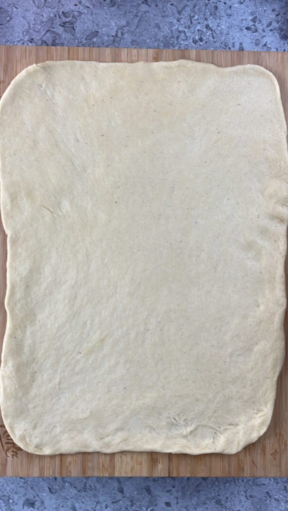 Neem het gerezen deeg terug en rol het met behulp van een deegroller uit tot een rechthoek.