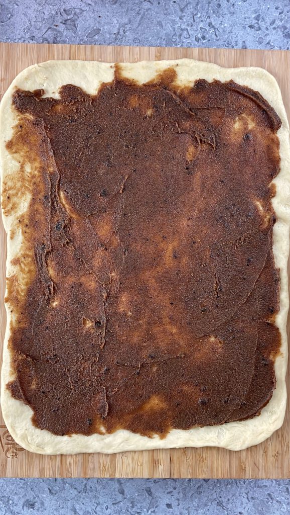Smeer de kaneelvulling op het gerezen deeg met behulp van een banketbakkerspatel of een mes.