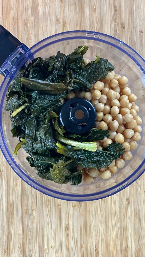 Doe zowel de gekookte kikkererwten als de cavolo nero in de kom van een blender of keukenrobot.Voeg vervolgens de voedingsgist toe (niet de gist voor bakken), de gerookte paprika of andere kruiden naar jouw smaak, het knoflookpoeder en de extra vierge olijfolie.