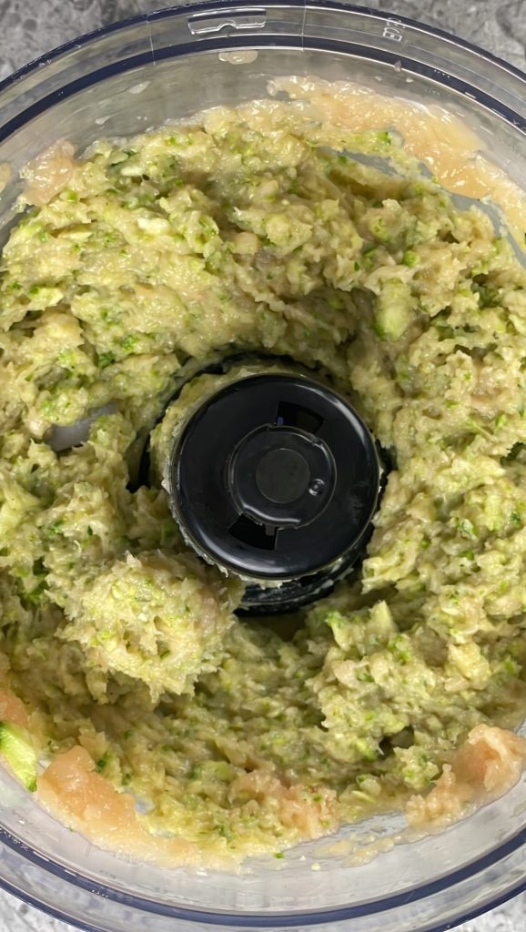 Doe deze in de blender en blend de kip goed tot je het mengsel op de foto krijgt.Was de romaanse courgettes, verwijder de uiteinden en snijd ze in stukjes.