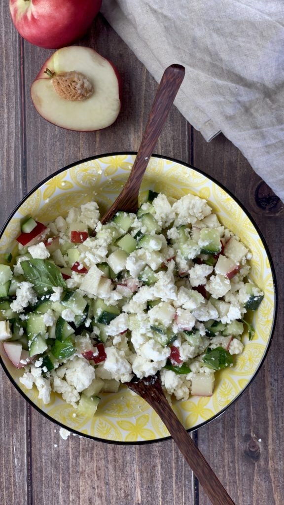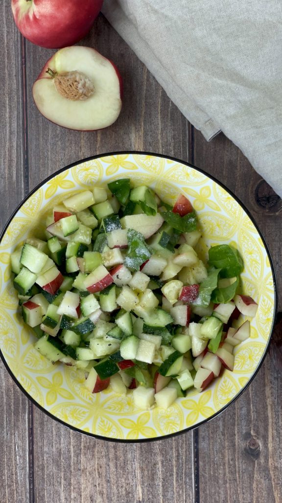 Komkommer- en perziksalade, een frisse, lichte en heerlijke schotel, perfect voor de zomer. Deze salade combineert zoete, zoute en lichtzure smaken tot een harmonie van smaken die het gehemelte prikkelen.