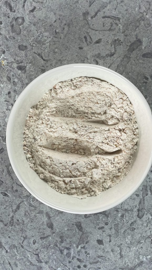 • Begin met de voorbereiding van de krokante en gekruide gebraden kip door de bloem in een kom te doen.