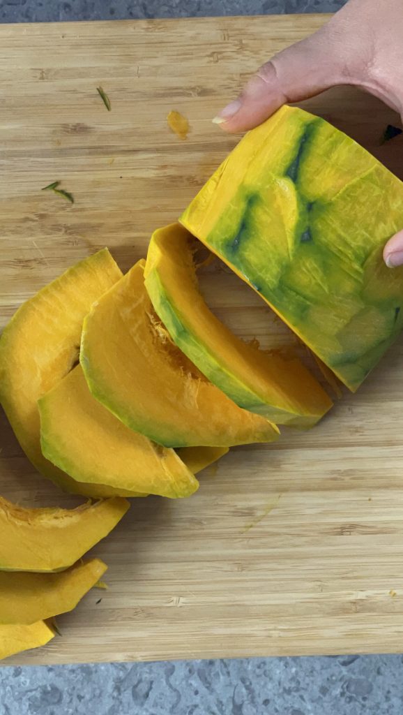 Verwijder de zaden (gooi ze niet weg, geroosterd in de oven zijn ze heerlijk) en verwijder de schil.Snijd de pompoen in plakjes van 1-2 cm dik en doe ze in een kom.