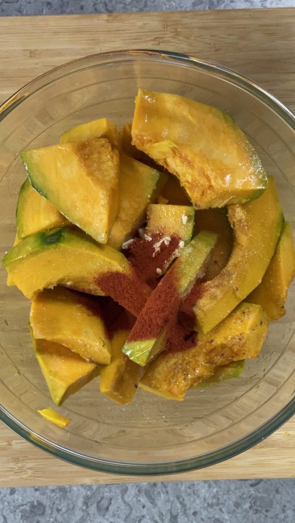 Het recept bevat een kruidenmix met paprika, maar je kunt het personaliseren naar eigen smaak. Kruiden zoals kerrie, komijn, kurkuma, kaneel of nootmuskaat passen goed bij de zoetheid van de pompoen.