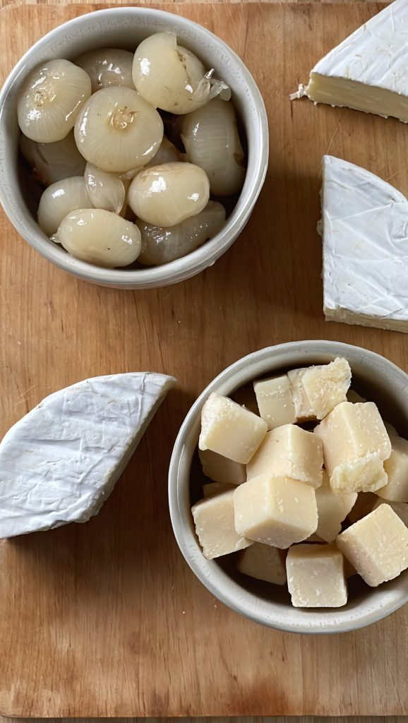 Om het geheel af te maken, heb ik zilveruitjes in azijn toegevoegd, die met hun zoetzure noot de intensere smaken in balans brengen, en de freselle, krokant en perfect om te combineren met de vleeswaren en kazen.