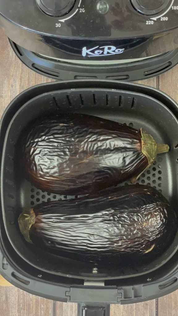 Leg de aubergines in het mandje van de airfryer en bak ze op 200°C gedurende ongeveer 25-30 minuten.Als ze eenmaal gaar zijn, leg ze in een kom en laat ze afkoelen.