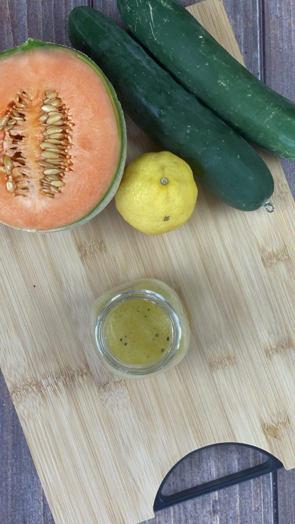 Begin met de voorbereiding van de meloen- en komkommersalade door de dressing.