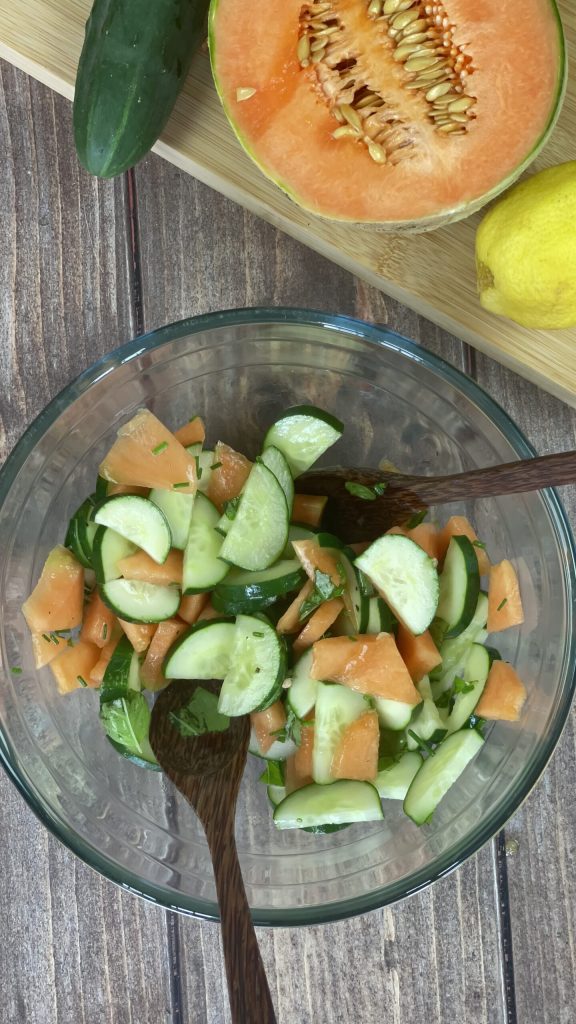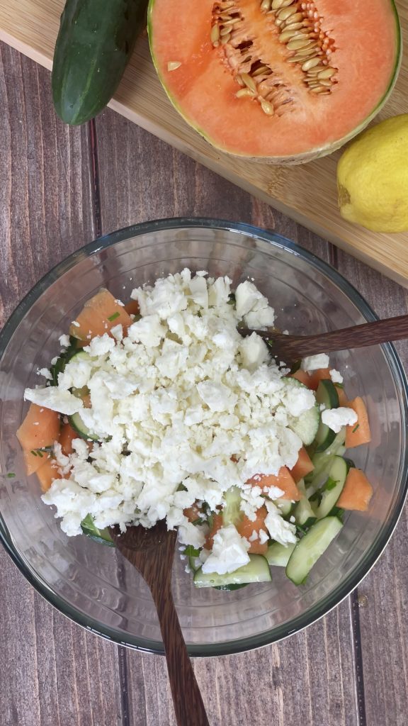 Meloen- en komkommersalade met Griekse feta, een frisse en lichte schotel, perfect voor zomerdagen die zoete en zoute smaken samenbrengt, waardoor een heerlijk en verfrissend smaak evenwicht ontstaat.