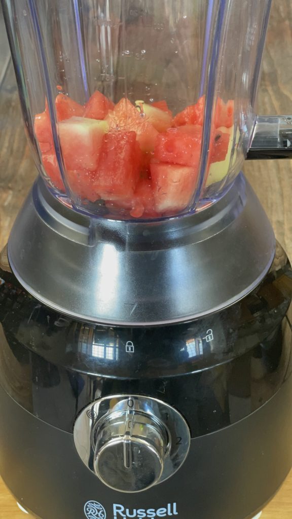 Verwijder de schil en de binnenste zaden en snijd de watermeloen in blokjes, je hebt in totaal 300g nodig.