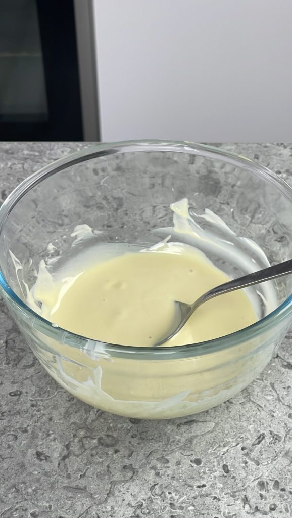 Na de rusttijd, haal de room uit de koelkast, verwijder de folie en roer het met een lepel of met een garde om het minder hard te maken.