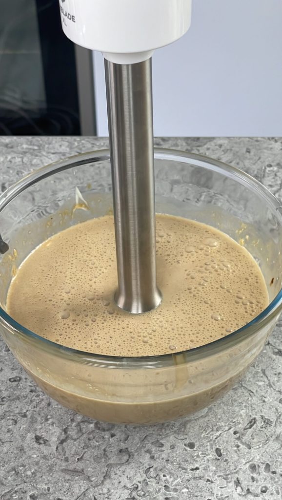 Meng het mengsel 30 seconden met een staafmixer zonder lucht erin te brengen.