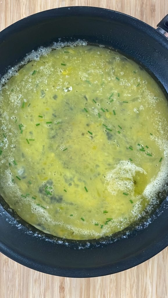 Voeg een of twee eetlepels melk of ongezoete plantaardige drank, zout en zwarte peper toe.Klop de eieren met de garde of met een vork en voeg eventueel gehakte kruiden toe, ik heb bieslook toegevoegd.