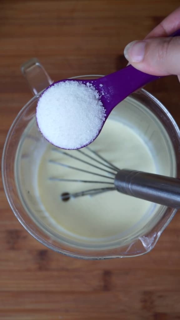 Voeg op dit punt ook de suiker en een snufje zout toe en mix opnieuw met de garde om alles te mengen.