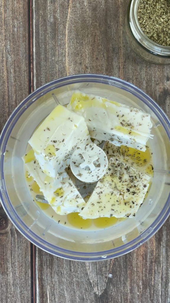 Doe de feta, het witte brood, een paar eetlepels melk, een flinke scheut olie, zwarte peper en oregano in een blender.Meng tot een glad en romig mengsel, als het te dik is, voeg dan nog wat melk toe.
