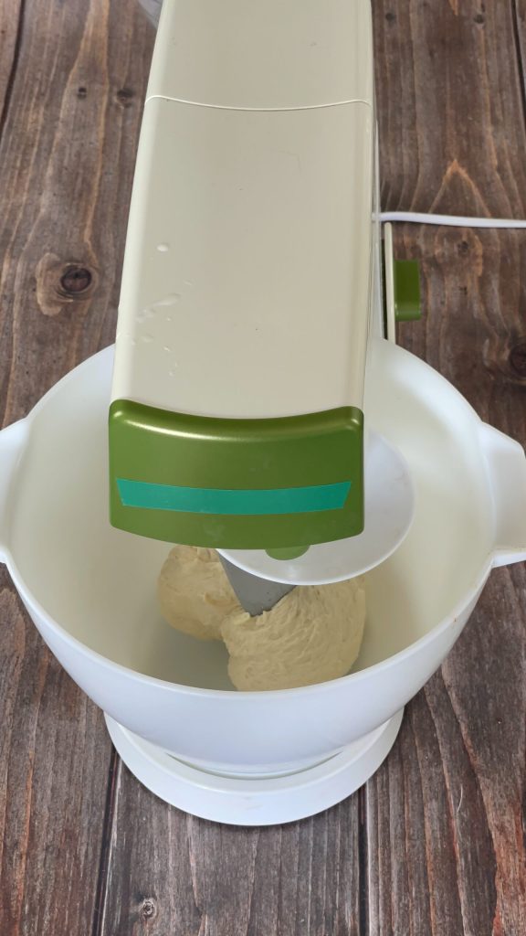 Kneed met de spiraalhaak op gemiddelde snelheid.Wanneer het deeg aan de haak gehecht is, stop en laat het 10 minuten rusten.