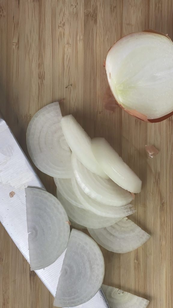 Begin de bereiding van de pompoen- en zoete aardappelsoep door een gele ui te schillen en in dunne plakjes te snijden.