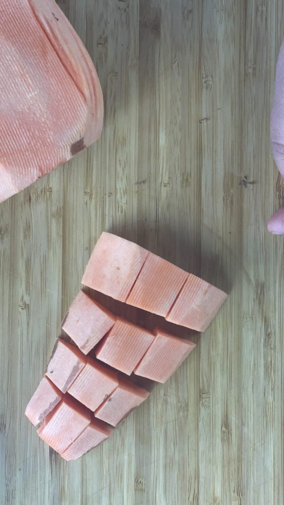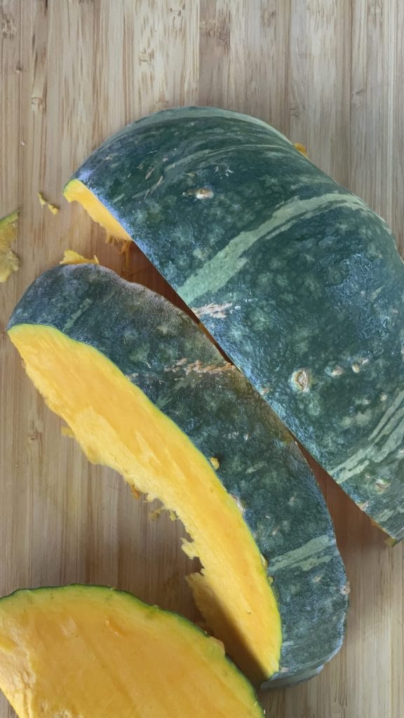 Snijd de pompoen vervolgens in plakken.Als je wilt, kun je de schil verwijderen, zoals ik heb gedaan.