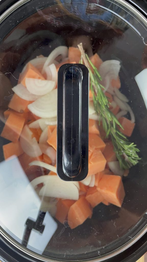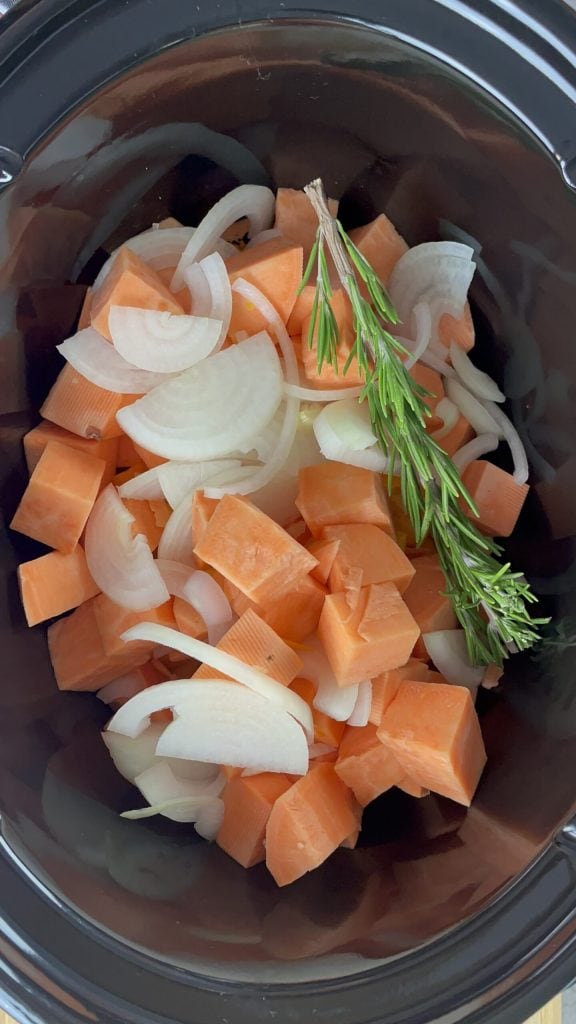 Voeg de eerder gesneden groenten toe.Voeg in de slowcooker ook een takje rozemarijn toe.