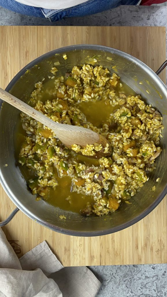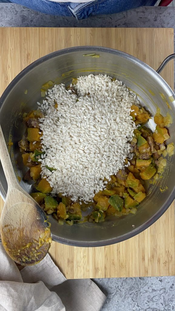 Risotto met pompoen en kastanjes, een perfect gerecht voor de herfst, dat de zoetheid van delica-pompoen combineert met de zachte noot van kastanjes, wat een combinatie van rustieke en verfijnde smaken creëert.
