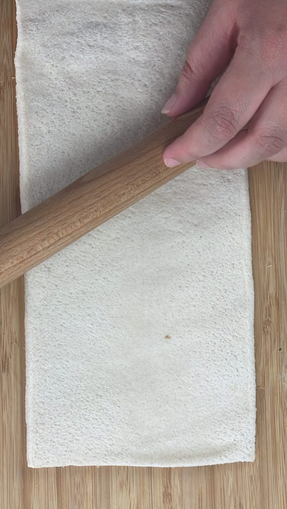 Begin de voorbereiding van de sandwichrozen door elk vel brood voor sandwiches uit te rollen met de deegroller, het moet een dikte bereiken van niet meer dan een paar millimeter.