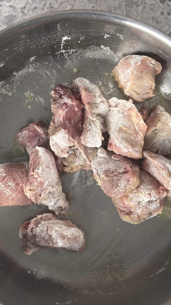 Begin met de bereiding van de Shepherd’s Pie met het bestuiven van het rundvlees met bloem: meng goed zodat alle stukjes vlees bedekt zijn met bloem.