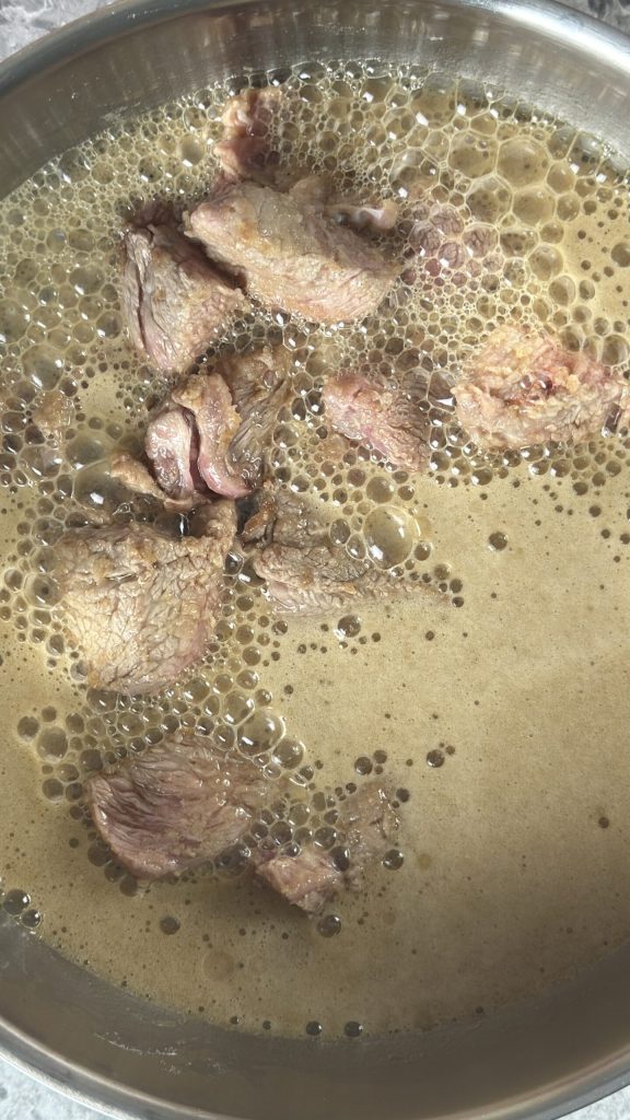 Verhit in een pan de extra vergine olijfolie en voeg vervolgens het rundvlees toe en schroei het goed dicht.